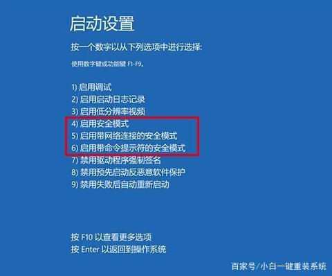 启动后将进入启动选项,选择第4项或第5项,第6项不建议小白使用,将不出现桌面。 4.启用安全模式 5.启动带网络连接的安全模式 6.启动带拿命令提示符的安全模式